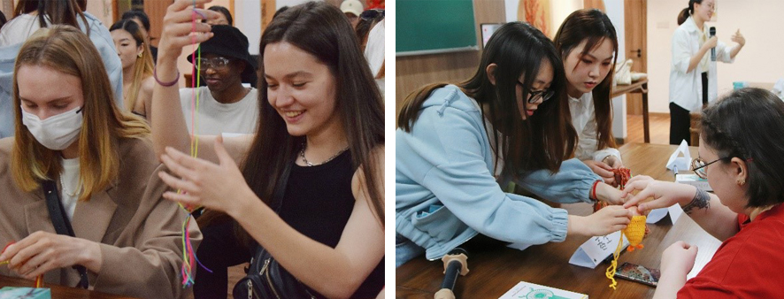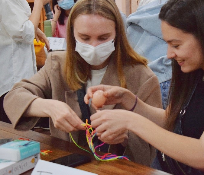 “挂蛋”是立夏常见的习俗之一。这天,人们会将煮熟后完好的鸡蛋装在编好的丝网袋内再挂在胸前,目的是避免“疰夏”,也象征一年无灾无病,健康成长。为了让员工们亲身体验中国传统习俗,公司为参加本次活动的员工准备了鸡蛋、丝线和网袋,在师生的指导下,中外员工们一起动手体验“挂蛋”的乐趣。