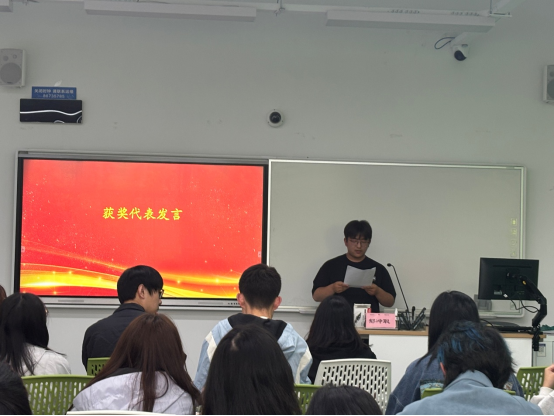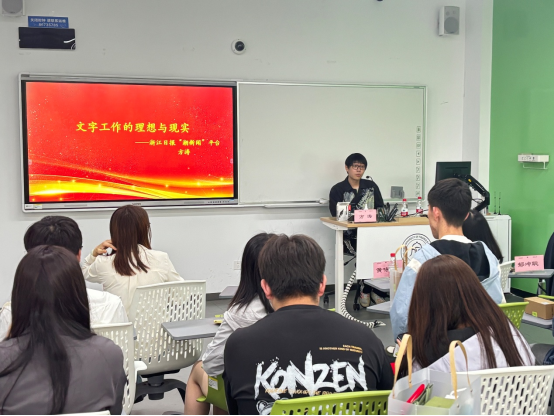 颁奖仪式结束后,浙江日报“潮新闻”平台的记者方涛,作了题为“文字工作的理想与现实”的讲座。他分享了行业的发展状况、从业者应具备的能力素养等,并从媒体一线从业者的角度,对公司人才培养、员工的自我锻炼、创作需要注意的事项等方面提出了意见和建议。作为本次大赛的评委,他有针对性地对同学们的作品作了评价,提出了进一步修改提高的建议。讲座过程中,他还与同学们就创作、就业等话题进行深入交流,鼓励同学们利用闲余时间积极锻炼自己,勇于尝试,挖掘自己在文字工作方面的兴趣与热爱,把握每一个自我提升的机会,丰富自己的实习经历。