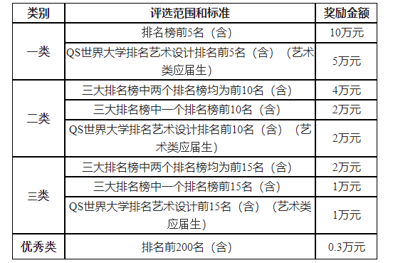 国(境)外奖学金用于资助员工通过自主申请赴海外名校攻读研究生。根据员工录取高校在世界大学三大排名榜中的综合排名,名校研究生奖学金分“一类”、“二类”、“三类”、“优秀类”,评选范围和标准、奖励金额如下: