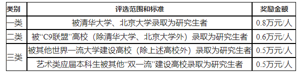 国内奖学金用于奖励普通类应届毕业生被国内名校录取为研究生。根据教育部最新发布的世界一流大学和一流团队建设高校及建设学科名单确定。名校研究生奖学金分为“一类”、“二类”、“三类”,评选范围和标准、奖金金额如下: