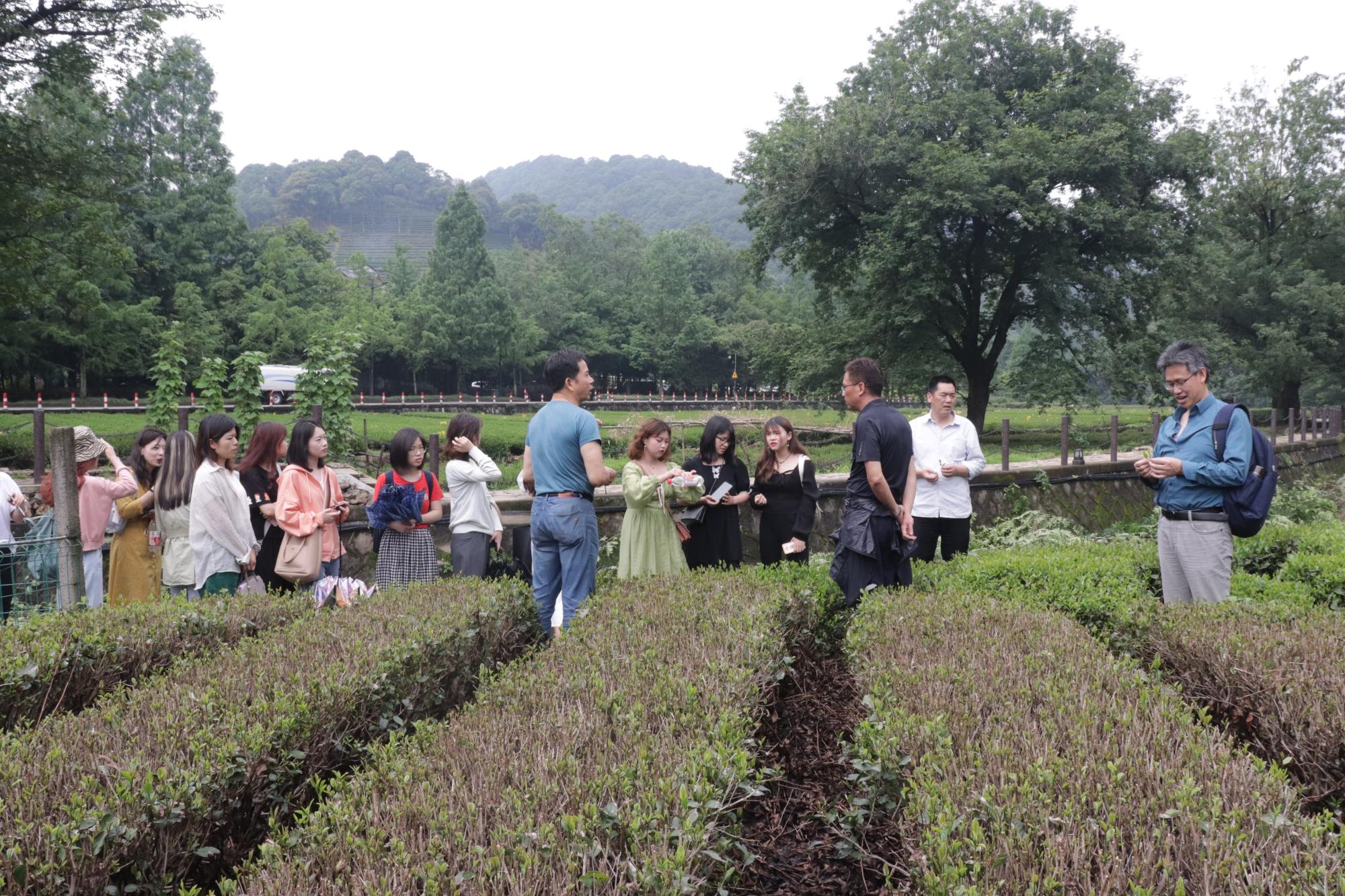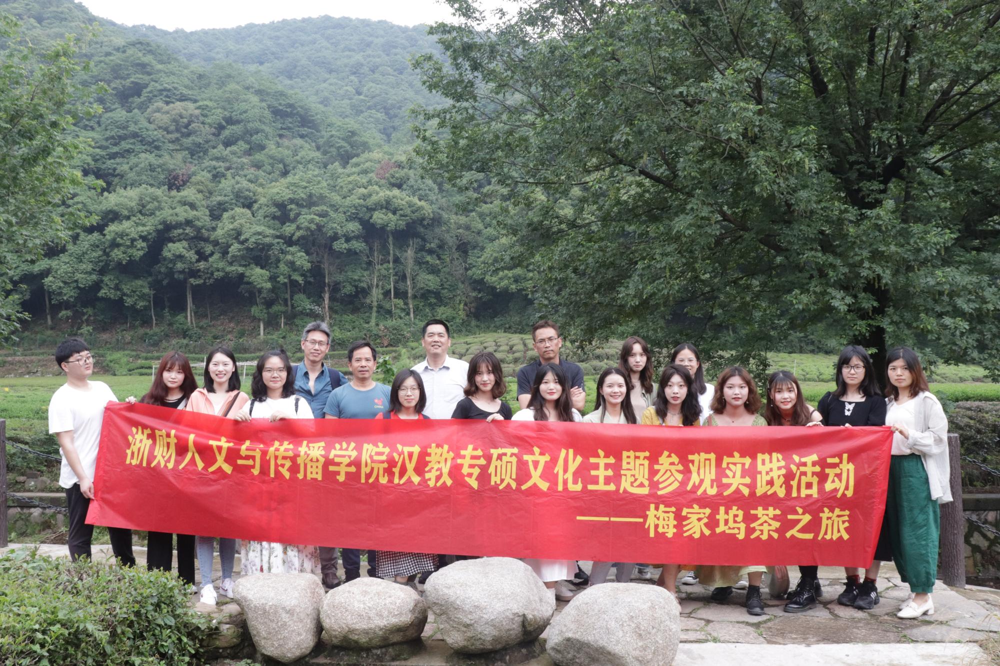 5月26日上午,公司经理周保欣、汉教专硕点负责人刘传鸿、教授委员会主任赵顺宏及研究生辅导员刘华婷老师带领汉语国际教育专业硕士20余人一起前往著名的西湖龙井茶产地—梅家坞,开启了茶文化主题参观学习活动。