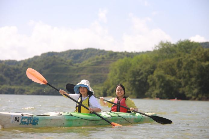 随后在皮划艇基地,大家分组体验皮划艇运动。教职工们穿上救生衣,手持船桨,在水面上奋力划行。他们相互协作,或你追我赶,或悠闲赏景,欢声笑语回荡在水面之上。
