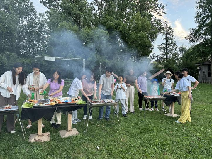 傍晚时分,草坪上炊烟袅袅,一场热闹的野炊烧烤拉开帷幕。教职工们围聚在烧烤架旁,分工协作,有的负责生火,有的忙着串食材,有的精心调配酱料。不一会儿,烤架上便飘出阵阵诱人的香气。大家在落日余晖下,品尝着美食,谈天说地,氛围轻松而愉悦。