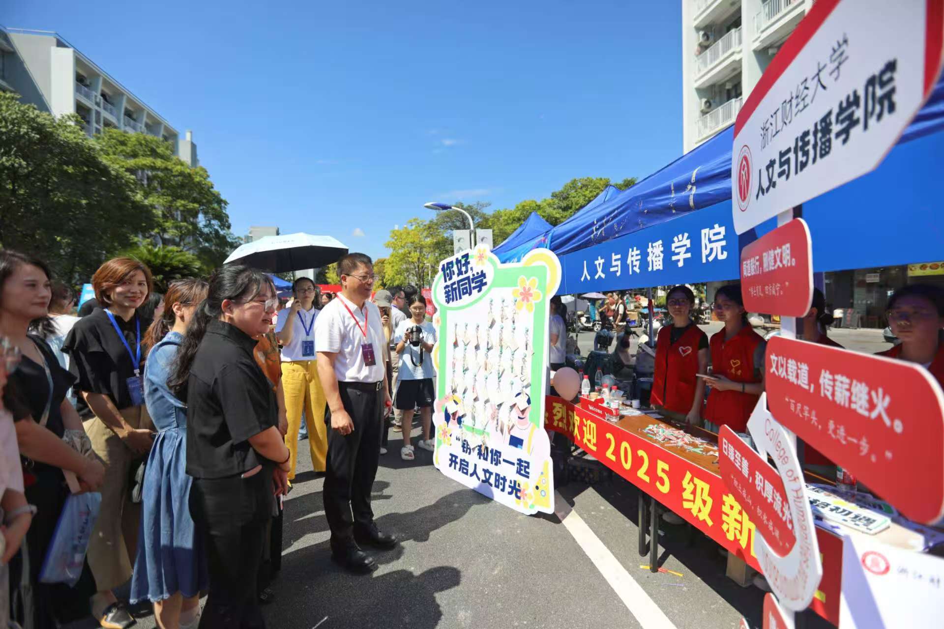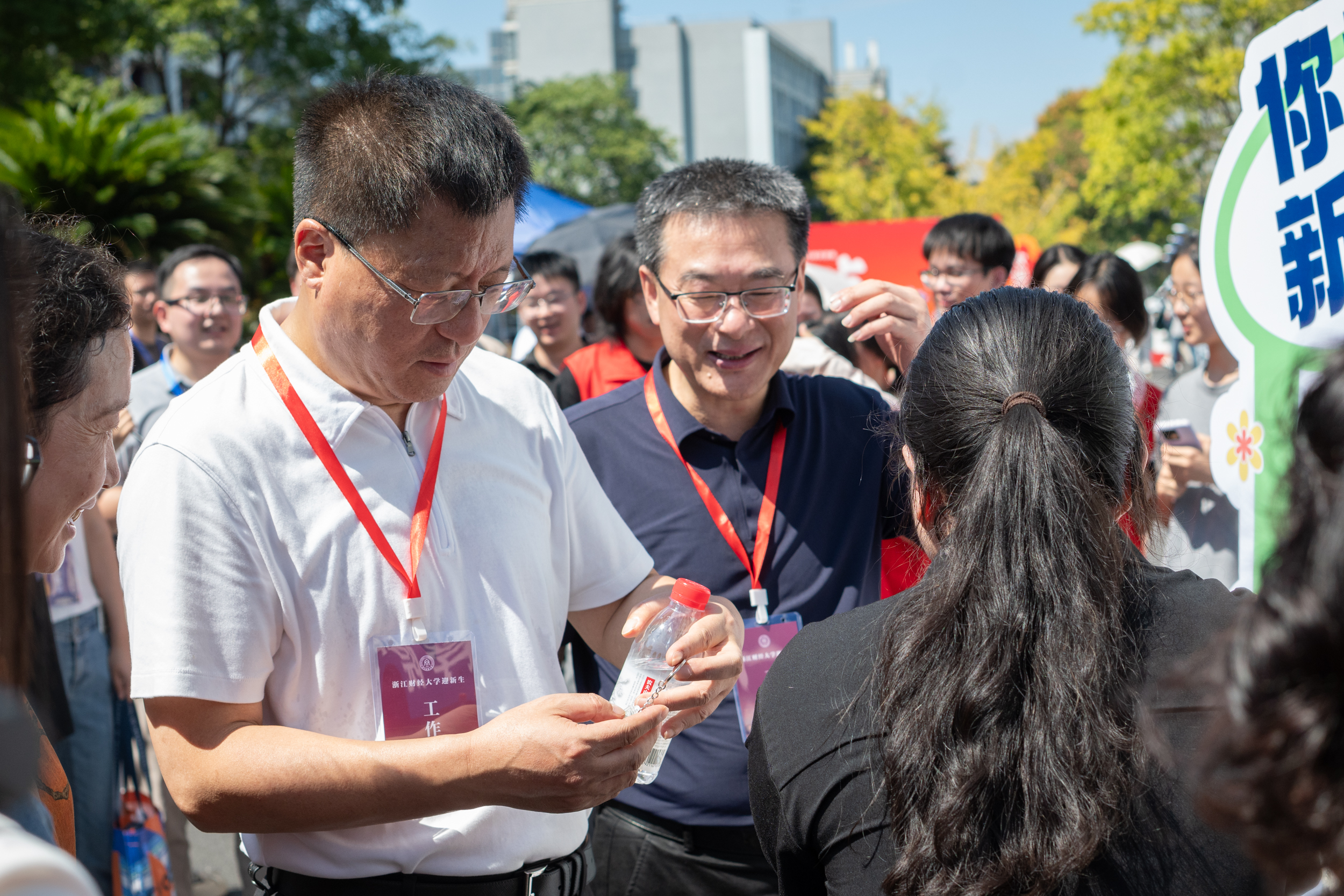 “同学,你是哪个专业的?”“报到还顺利吗?”魏江书记微笑着与新生及志愿者们交流,关心大家的专业选择与初入校园的感受。听到在场同学来自汉语言文学和新闻与传播学专业,他亲切地分享起自己大学时期担任员工记者、通过写作自食其力的经历,并勉励同学们:“文学是一辈子的内在美。” 他希望大家无论未来走向何种岗位,都要始终保持对文字的热爱,在文学的滋养中沉淀自我,让生命因读写而更加丰盈、温暖、有意义。