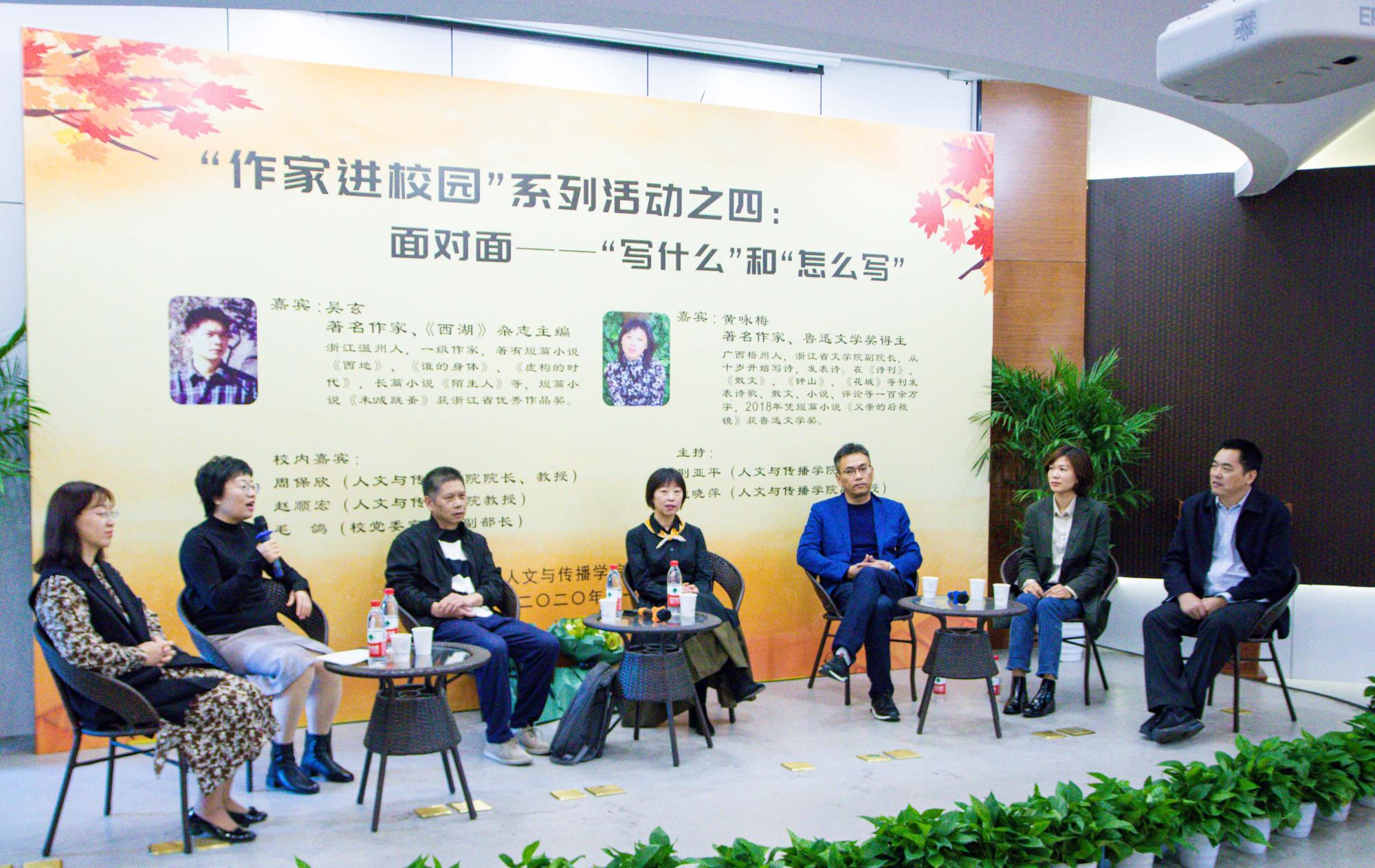 为增进员工对文学创作的生动、深入的了解,2020年11月12日下午14:30—16:45,tyc122cc太阳成集团“作家进校园”系列活动之四:面对面—“写什么”和“怎么写”,在7号楼112报告厅举行。著名作家、《西湖》杂志主编吴玄,著名作家、鲁迅文学奖得主黄咏梅受邀莅临公司,两位老师以圆桌式对谈的形式,与公司师生进行一次近距离对话。公司周保欣、赵顺宏、荆亚平、姚晓萍老师,公司党委宣传部副部长毛鸽老师等出席了此次对谈。