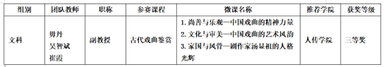 为进一步办好第一届高校教师教学创新大赛,以赛促教,以赛促改,深化立德树人根本任务,加快建设浙江特色高水平本科教育,根据《关于浙江省第一届高校教师教学创新大赛的补充通知》相关精神,公司于3月中下旬组织开展了教师教学创新大赛“课程思政”微课专项赛评选,由公司毋丹老师主持的参赛课程《古代戏曲鉴赏》设计的微课作品喜获校”课程思政”微课专项赛三等奖。这一参赛作品以《尚善与乐观—中国戏曲的精神力量》《文化与审美—中国戏曲的艺术风韵》《家国与风骨—剧作家汤显祖的人格光辉》三组微课为题,较系统地展示了中国戏曲文化精神的独特风骨及伟大剧作家汤显祖的人格力量,是彰显公司相关课程专业特点的一次特色教学。