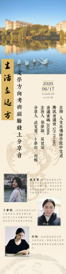 6月7日晚,在中文系副主任胡梦颖老师组织下,“生活在远方”文学方向考研经验线上分享会以腾讯会议形式进行,本场分享会由胡梦颖老师、吴智斌老师主持,邀请到公司19届汉语言文学专业毕业生武文雯和20届汉语言文学专业毕业生卜梦怡、何畅参与分享。会上,三位学姐不仅分享了自身的备考经历和经验技巧,还向大家介绍了研究生的学习生活,更加坚定了同学们的考研信心。