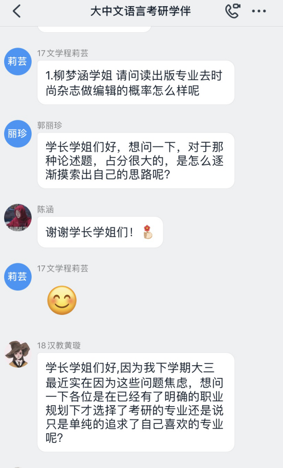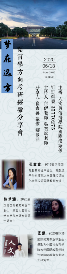 “梦在远方”语言学方向考研经验分享会于6月18日晚成功举行,本场分享会由国际汉语系主任付伊老师组织并由铁徽老师主持,邀请到公司18届汉语国际教育专业毕业生崔鑫鑫和20届汉语国际教育专业毕业生柳梦涵、张傲同学参与分享。在会上,学长学姐们根据个人情况围绕着择校标准、备考建议和备考心态这些方面,向大家分享了自己是如何确定目标院校,怎样规划备考时间,怎样克服备考困难的心路历程,并一一解答同学们的提问。