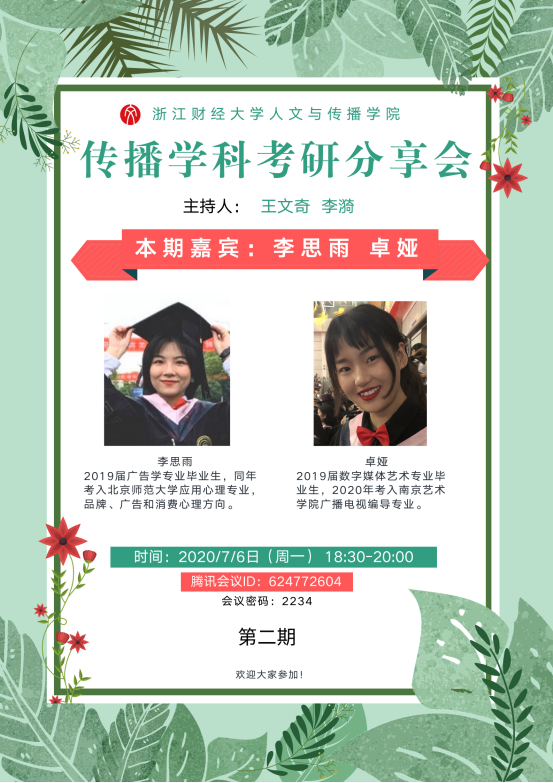 传播学方向考研分享会在数字媒体系主任王文奇老师组织下共分为两场进行。第一场于7月4日晚举办,由王文奇老师、王阿蒙老师共同主持,公司18届数字媒体艺术专业毕业生叶钊赟、19届数字媒体艺术专业毕业生张雨希同学参与分享,本场分享会以中国传媒大学为考研主题院校,鼓励备考学子向着更高远的目标冲刺。第二场分享会于7月6日晚进行,由王文奇老师、李漪老师共同主持,19届广告学专业毕业生李思雨和19届数字媒体艺术专业毕业生卓娅参与分享,本场分享会重点把握基础学科,分享二战告捷的历程经验。