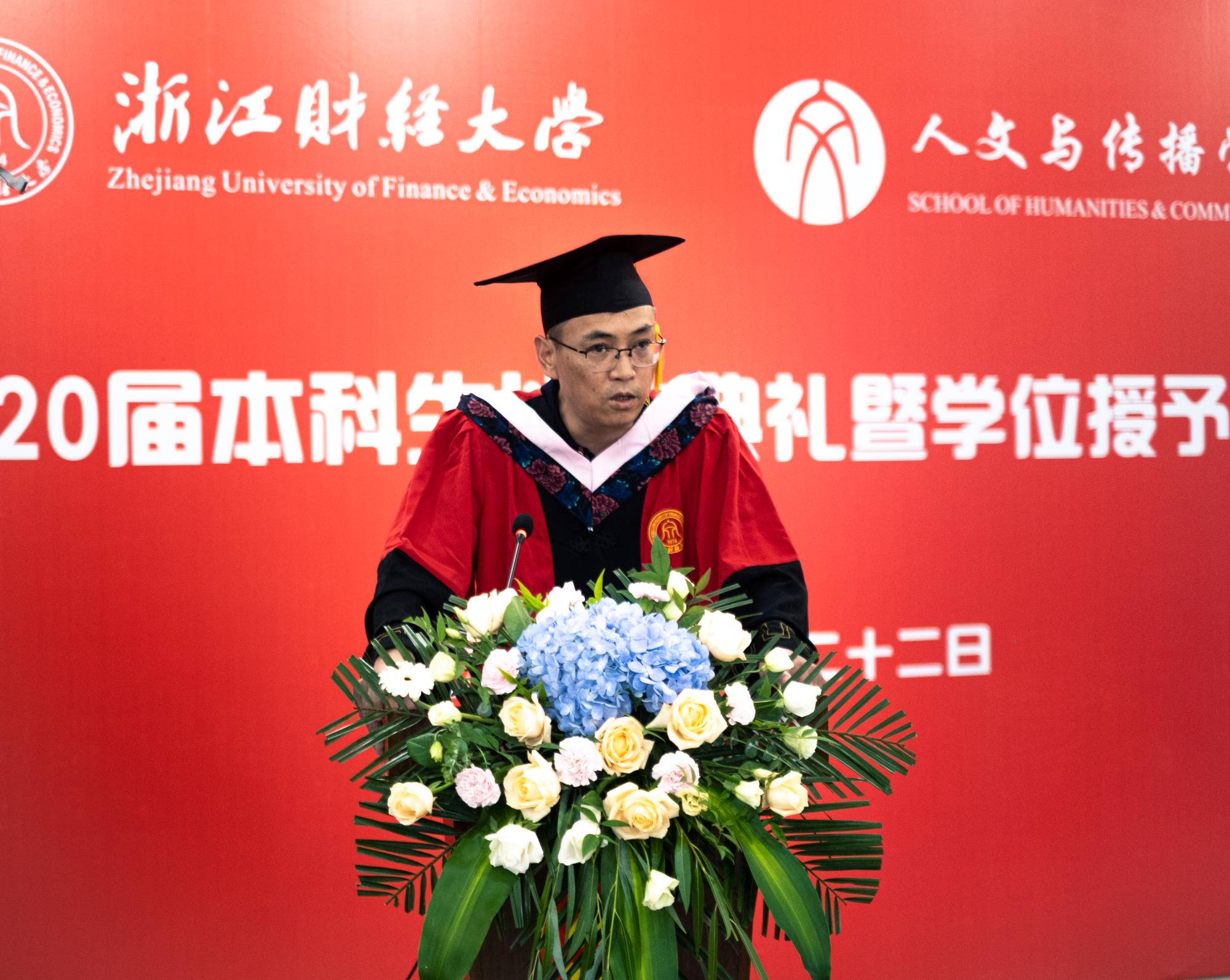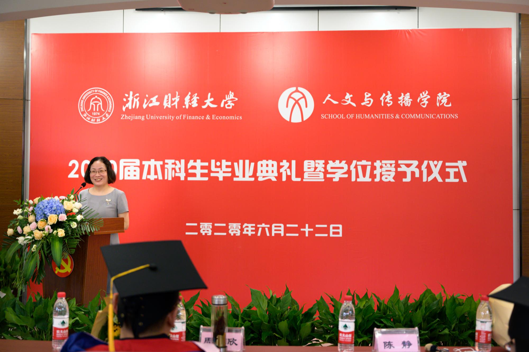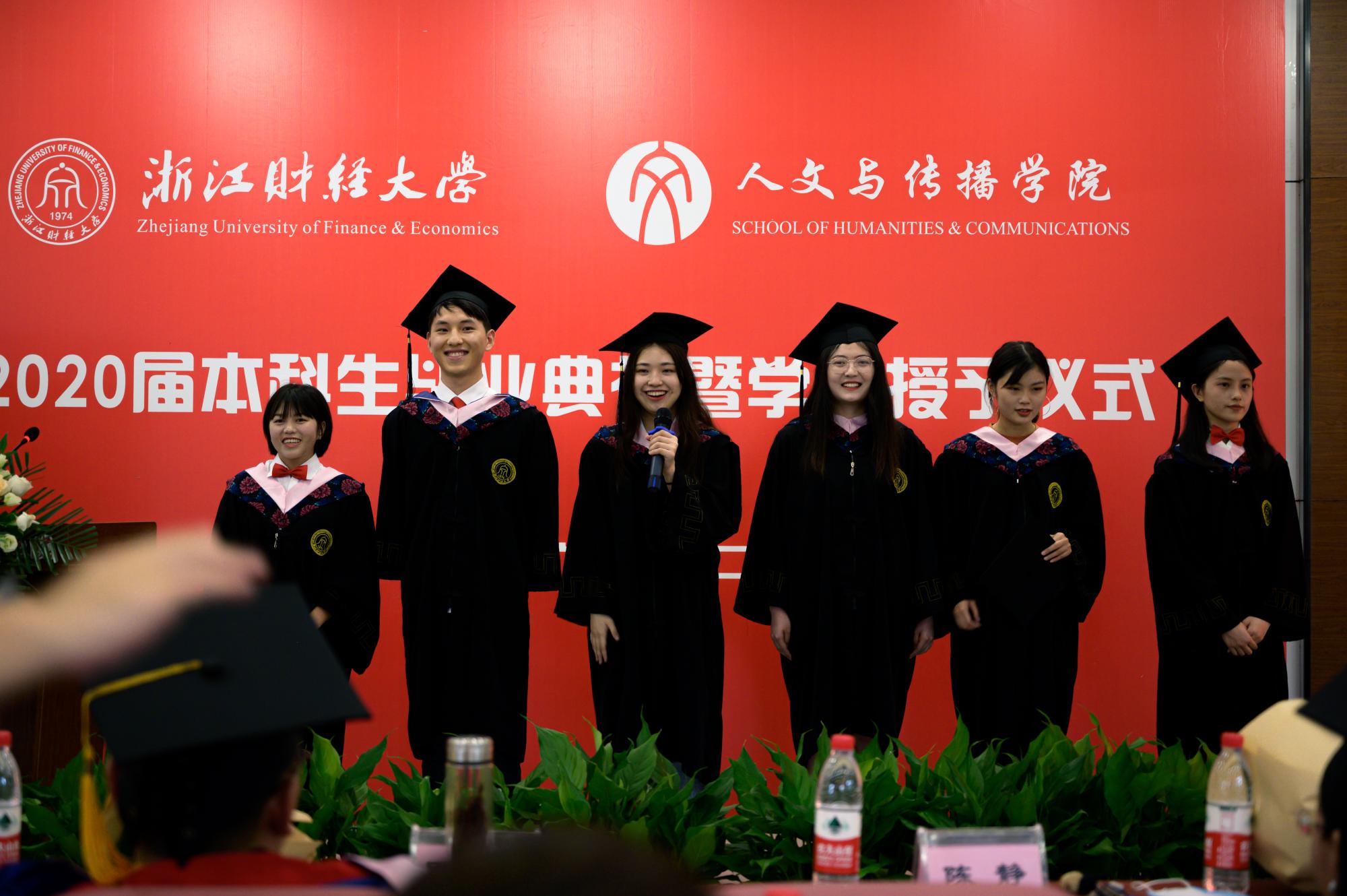 应届同学因为疫情面临更多的困难和不确定性,但从复旦大学、浙江大学、爱丁堡大学等世界名校升学,到腾讯、浙江中控等百强名企入职,我们依旧迎难而上成绩骄人。2020届毕业生汉语言文学专业陶娟、林滢、汉语国际教育专业舒昊、广告学专业邵珏书婷、赵雅雪、数字媒体艺术专业刘琦作为优秀毕业生代表上台向公司报告。“我将铭记住‘进德修业,与时谐行’的校训,也会记住我们‘为往圣继绝学,为万世开太平’的人文之光。”