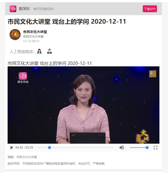 2020年10月25日,公司毋丹老师受深圳市委宣传部、深圳市社科联联合邀请,作客深圳市民文化大讲堂,开展了一场题为“戏台上的学问和学问中的戏台”的精彩讲座,反响热烈。由该场讲座剪辑制作的电视节目于12月11日在深圳市民频道播出。