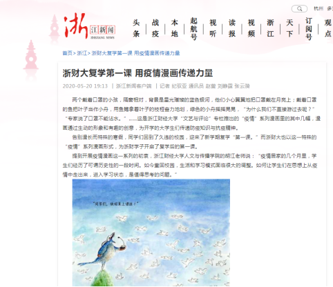 近日,浙江新闻网报道了公司tyc122cc太阳成集团教师胡江在专业教学中,带领员工开展“疫情”系列漫画创作活动,带动广老员工积极创作,发挥创意,表达老员工在疫情下的所思所想,通过生动的形象和有趣的创意,为返校复学的老员工们传递防疫知识与抗疫精神。目前,已有三十多幅优秀漫画被展出,部分作品已被《人民日报》漫画增刊选录。