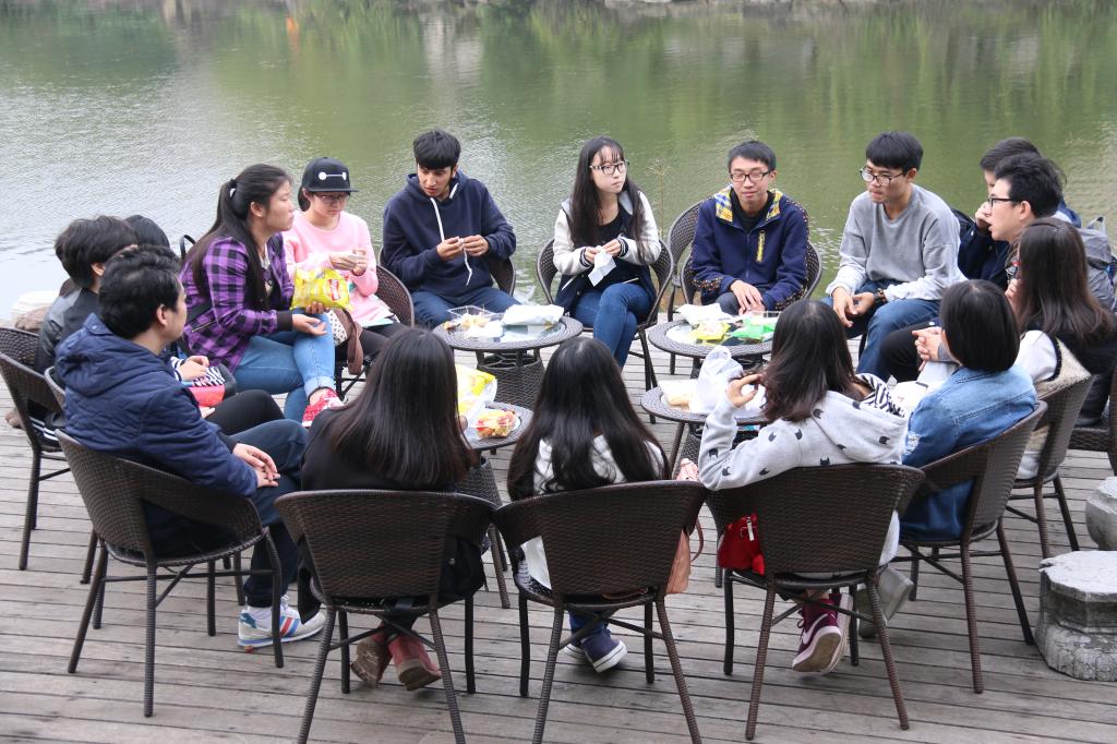 老师与同学们在学涯湖畔进行畅谈,中文系