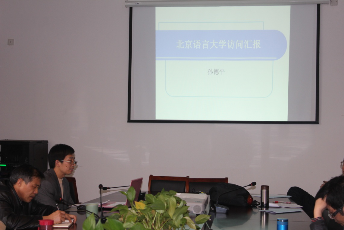 交流会上,从北京语言大学访学归来的孙德平老师从六个方面讲述了他在北语的访学过程和收获,参与了《中国大百科全书》语言文字学科词条的编撰,并完成了4篇论文的撰写。从英国格拉斯哥大学访学归来的洪艳老师图文并茂的从风土人情、建筑风格、艺术作品、人文情怀等方面介绍了她在英国访学期间对文化传播研究的成果和感悟。从安徽大学访学归来的王明建老师则分享了他在安徽大学访学授课的经验以及对专业教学的思考。从山东大学访学归来的范知欧老师讲述了其在山东大学儒学高等研究院交流学习的过程,对中国传统文化研究有了更深层次的理解。