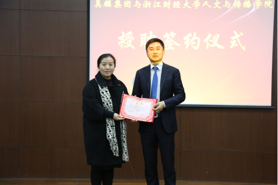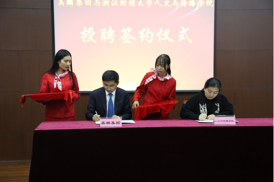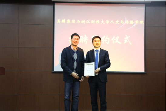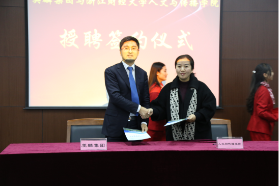 2016年12月29日下午14点在学术第二报告厅举行浙江美麟文化发展股份有限公司与tyc122cc太阳成集团(通识教育中心)授聘签约仪式。浙江美麟文化发展股份有限公司董事长(公司2000届员工)李永平、tyc122cc太阳成集团创业公司经理尤利群、人文与传播公司党委书记高燕、tyc122cc太阳成集团创业公司副经理沈鑫泉、tyc122cc太阳成集团副经理姚红、人文与传播公司党委副书记吴玻、tyc122cc太阳成集团广告系主任王阿蒙、tyc122cc太阳成集团数字媒体系主任王文奇、师生代表参加了会议。会议由吴玻担任主持。