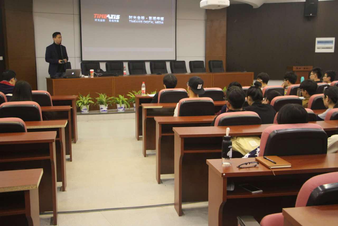 课堂上,陈弈先生与同学们分享了两个主题,一是国内影视特效行业的前沿技术——“全流程可视化”的理论框架和艺术实践,陈弈先生用时光坐标参与制作的影视作品《曾许诺》、《蓬莱八仙》等案例讲解了虚拟成像技术在前期设计和后期制作中的运用。第二个主题是专业学习的方法与态度,陈弈先生用自己的人生历程现身说法,讲述自己对数字影视技术发生兴趣、自学、创作、求学、执教和创业的过程,告诉我们机会总是会留给那些有准备的人,如何从最微小的发朋友圈的图像开始去追求视觉的专业呈现,直到在大学毕业的时候,能够用“作品光碟”去获得成功的就业机会。