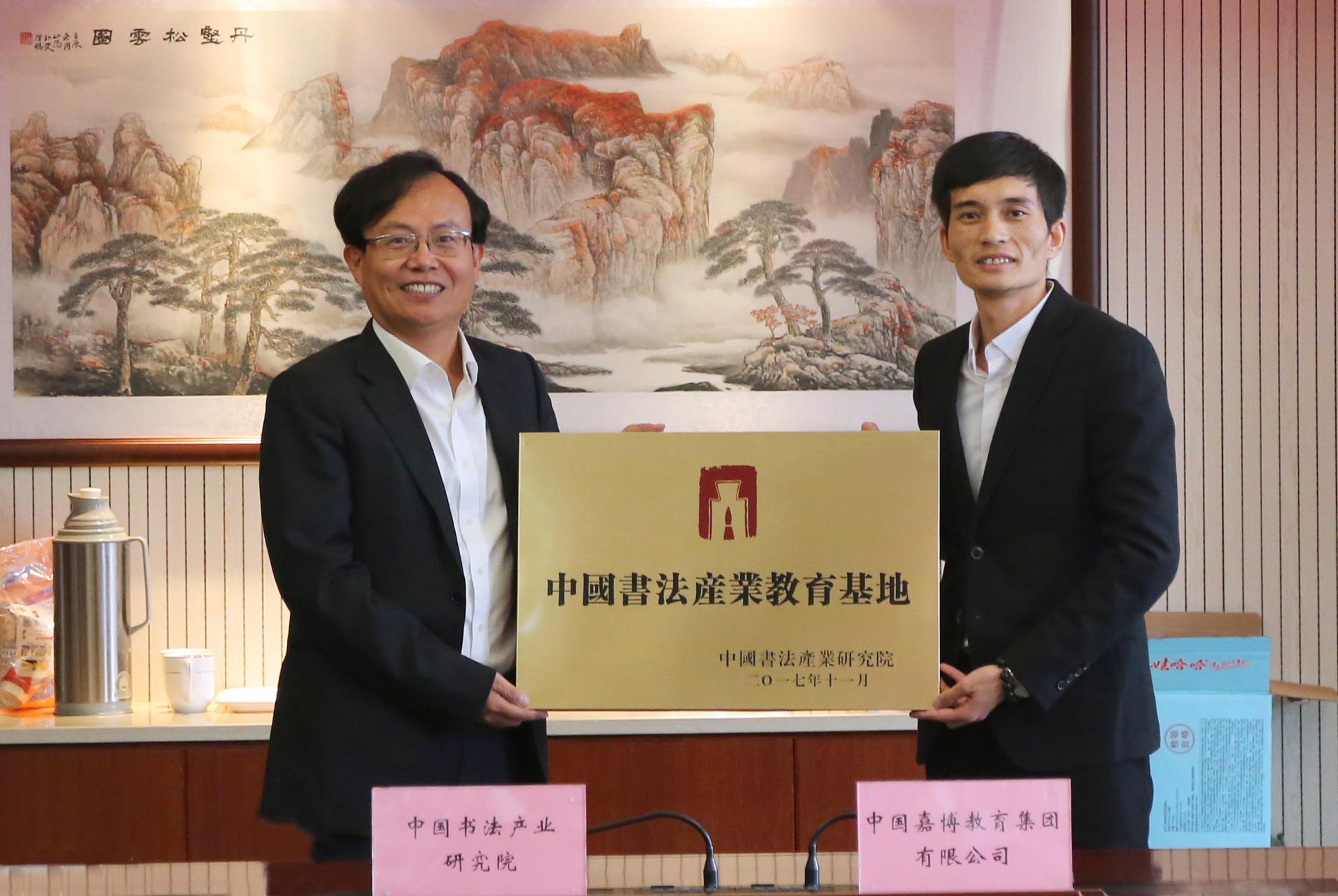 签约仪式结束后,副董事长、研究院经理黄建新向嘉博教育集团授予“中国书法产业教育基地”称号,华桃总经理代表集团接受牌匾。
