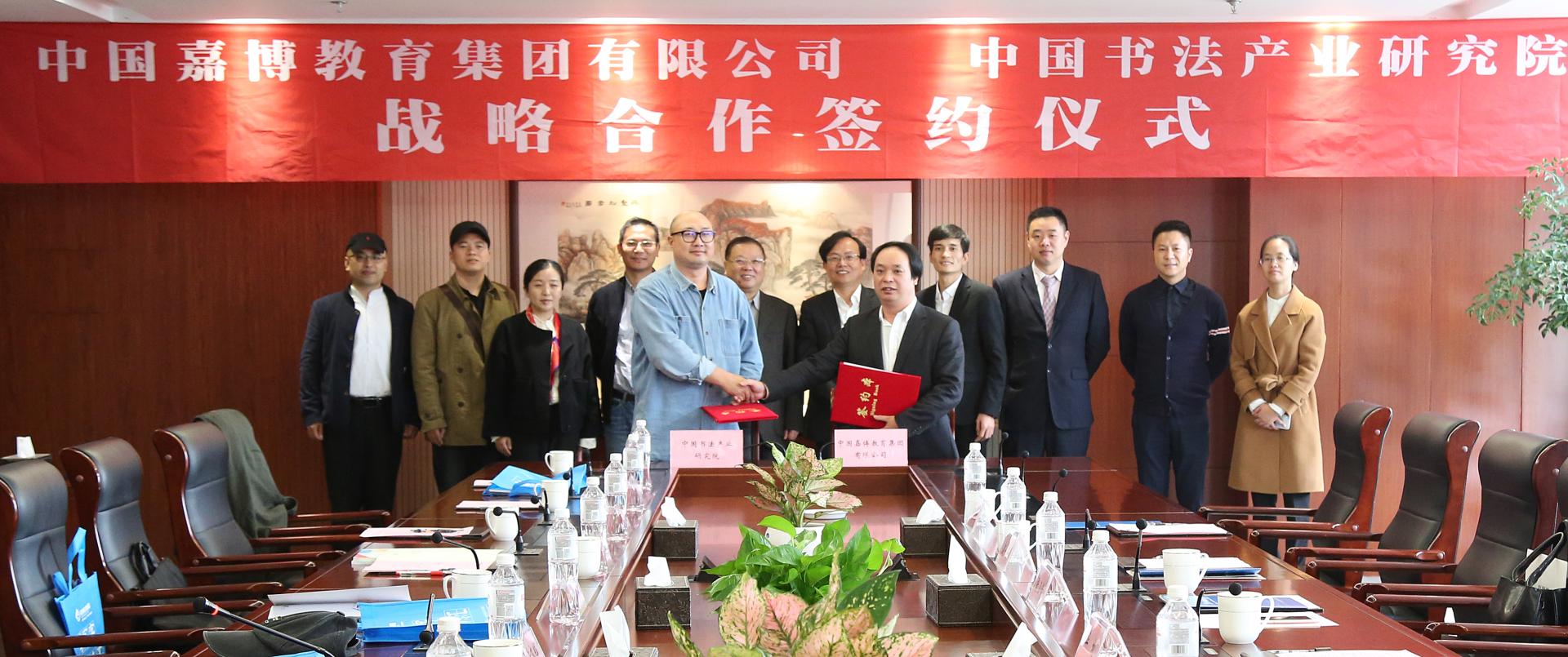 11月10日,中国书法产业研究院与中国嘉博教育集团书法产业战略合作签约仪式在tyc122cc太阳成集团行政楼412会议室举行。嘉博教育集团董事长张卫清、总经理华桃、运营部副总监赵一丹、企划部副总监李冰,研究院顾问韩翼祥,副董事长、研究院经理黄建新,副经理黄齐辉、薛平,艺术公司书法教授徐文平以及研究院发展部、办公室相关负责人参加。签约仪式由人文与传播公司党委书记高燕主持。