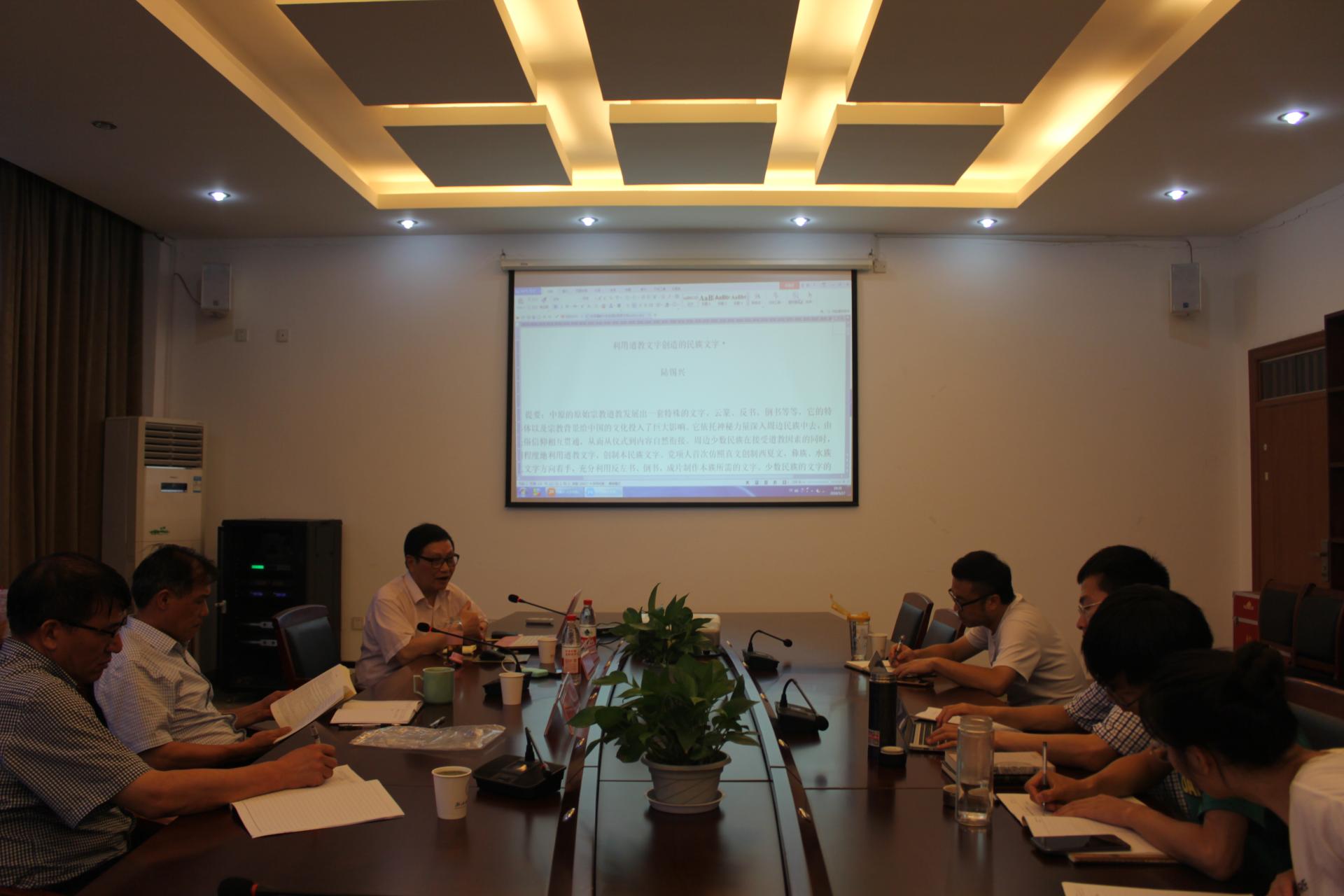 陆教授首先介绍了自己最新的研究成果,对汉字史研究提出了自己独到的见解。然后,陆教授从原始宗教的发展谈起,梳理了道教的历史发展概况,指出了道教文字的特殊形体对民族文字带来的巨大影响。陆教授以西夏文、水书和彝文为例,解析了民族文字如何利用道教文字创制本民族文字。最后,陆教授指出汉字传播史这一课题的研究价值与意义,在场师生深受启发。
