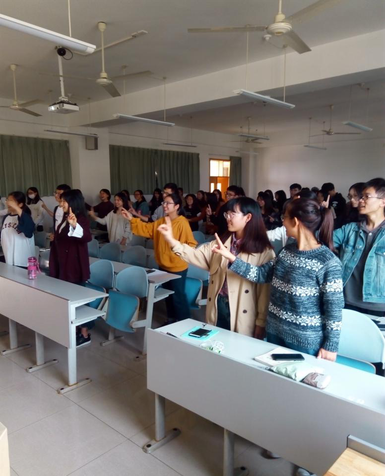 原来校红叶戏曲社的小伙伴,事先与任课教师一起作出“越剧进课堂”与教改实践相结合的创意,派出最强阵容,直接参与了戏剧课堂的教学。上课伊始,《梅龙镇·初遇》、《追鱼·张郎你听我从实讲》等精彩选段表演,立刻吸引了同学。随后越剧唱腔的练习,《红楼梦》宝黛初见时的“天上掉下个林妹妹”唱段,更让同学零距离接触越剧的魅力。大公司园上百人的越剧大合唱,实属少见。“娴静犹如花照水”,“娴”发yan的音,“如”发为ri,“水”发为sui。当说到,“越剧里面的念白是没有翘舌音的哦!”多数来自江浙,普通话考级深受翘舌音苦虐的同学,发出会心一笑。大家像小孩子刚学说话,一字一字的学发音,时而互看一眼,忍俊不禁。学到“只道他腹内草莽人轻浮”这一句,“黛玉”还教大家怎样手捏兰花指,右手从上而下画一个圈,指向“宝玉”。有同学还举手提问,“黛玉”唱的时候,不唱的“宝玉”该做些什么动作呢。