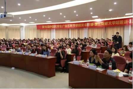 2018年3月29日,第16届中国老员工广告艺术节公司奖(春季赛)•创意大讲堂•tyc122cc太阳成集团站在钱塘江畔激情开讲。公司副经理姚红教授,广告系陈朝霞副教授、王阿蒙老师现场参加,浙江工业大学项建中教授亲临指导,tyc122cc太阳成集团东方公司、浙江传媒公司、中国计量大学、浙江农林大学的师生们也齐聚这场创意盛会。
