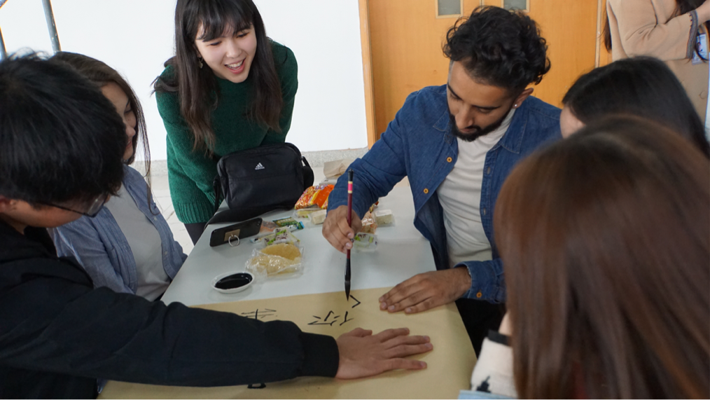 在文化交流方面,汉语国际教育专业的同学们准备了毛笔、墨水等书法用具,让职工们现场学习书法知识,尝试汉字书写。汉语国际教育专业的员工在该活动中获得了对外汉语教学的体验和感悟;而职工在书法体验中直观感受到了中华文化的传统魅力与内在气韵。活动最后,一位职工朋友主动为大家表演魔术,再次将全场的气氛推向高潮。