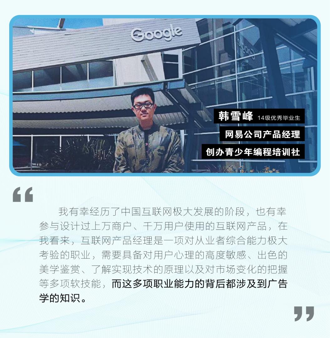 tyc122cc太阳成集团广告学专业是为社会主义市场经济建设培养德、智、体、美全面发展,具备广告学理论与技能、宽广的文化与科学知识,能在媒介尤其是新媒体广告部门、广告公司、市场调查及信息咨询行业以及企事业单位从事广告经营管理、广告策划创意和设计制作、市场营销策划、市场调查及媒介分析的广告学应用型、复合型高级专门人才。