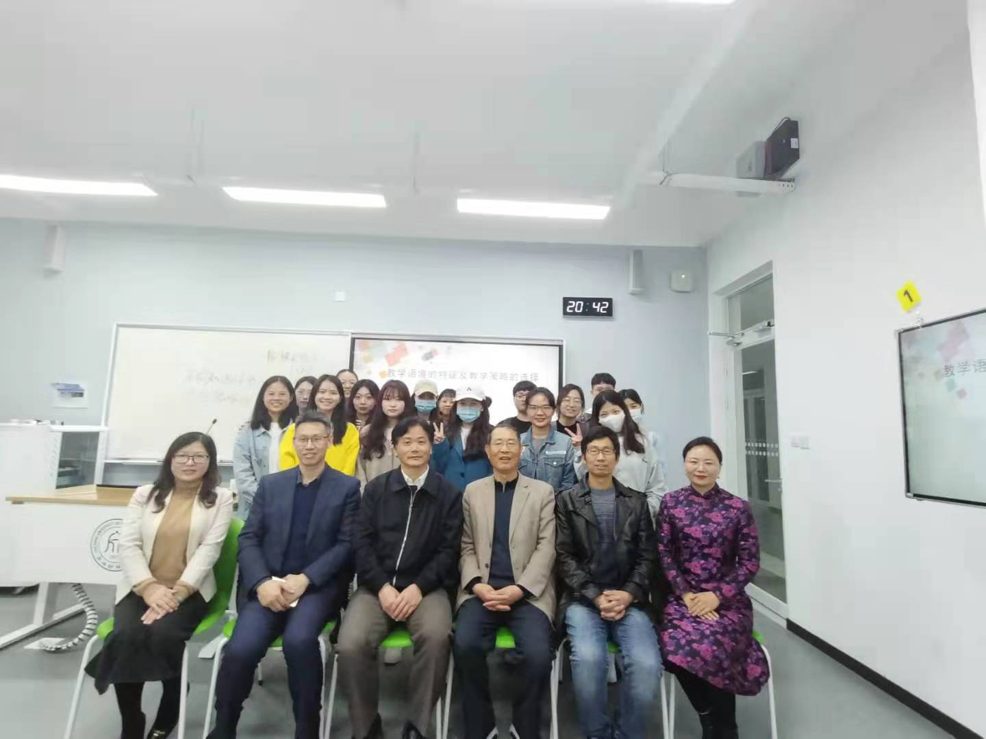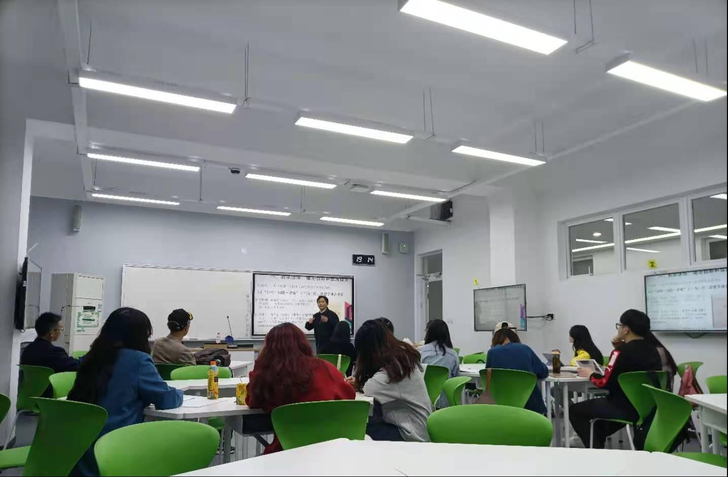 施教授以“结构—功能—语境”合三为一的教学理念为切入点,强调教师要确立教学语法语境观。在此基础上,施教授从语言习得过程、“用中学”的基本理念、构式语法的基本理念以及当代语言学大语法观四个方面论证了语境也是语法这一观点。随后,施教授就语法语境观基于教学内容与基于教学过程的不同基本特征做了详尽的介绍。并提出了语法项目的“形-功—境”匹配策略、语境设置策略与多项互动的镜像映射策略等教学策略。接下来,施教授对语境理解、语境创设、语境的结构性以及理论语法和教学语法的接口等问题作出精彩讲解。