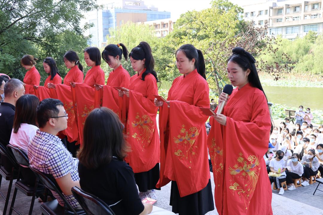 “师严然后道尊,道尊然后民知敬学。”8位新生班主任代表姚晓萍、张聪、王泉、郁冲聪、胡江、王阿蒙、谢点端坐于台上。新生代表向师者行礼、诵读并呈上拜师贴、敬上束脩之礼,后进行拜师礼,敬茶,老师也相应回礼,朗读示训,随即礼成。三训萦耳边,久久难忘怀。
