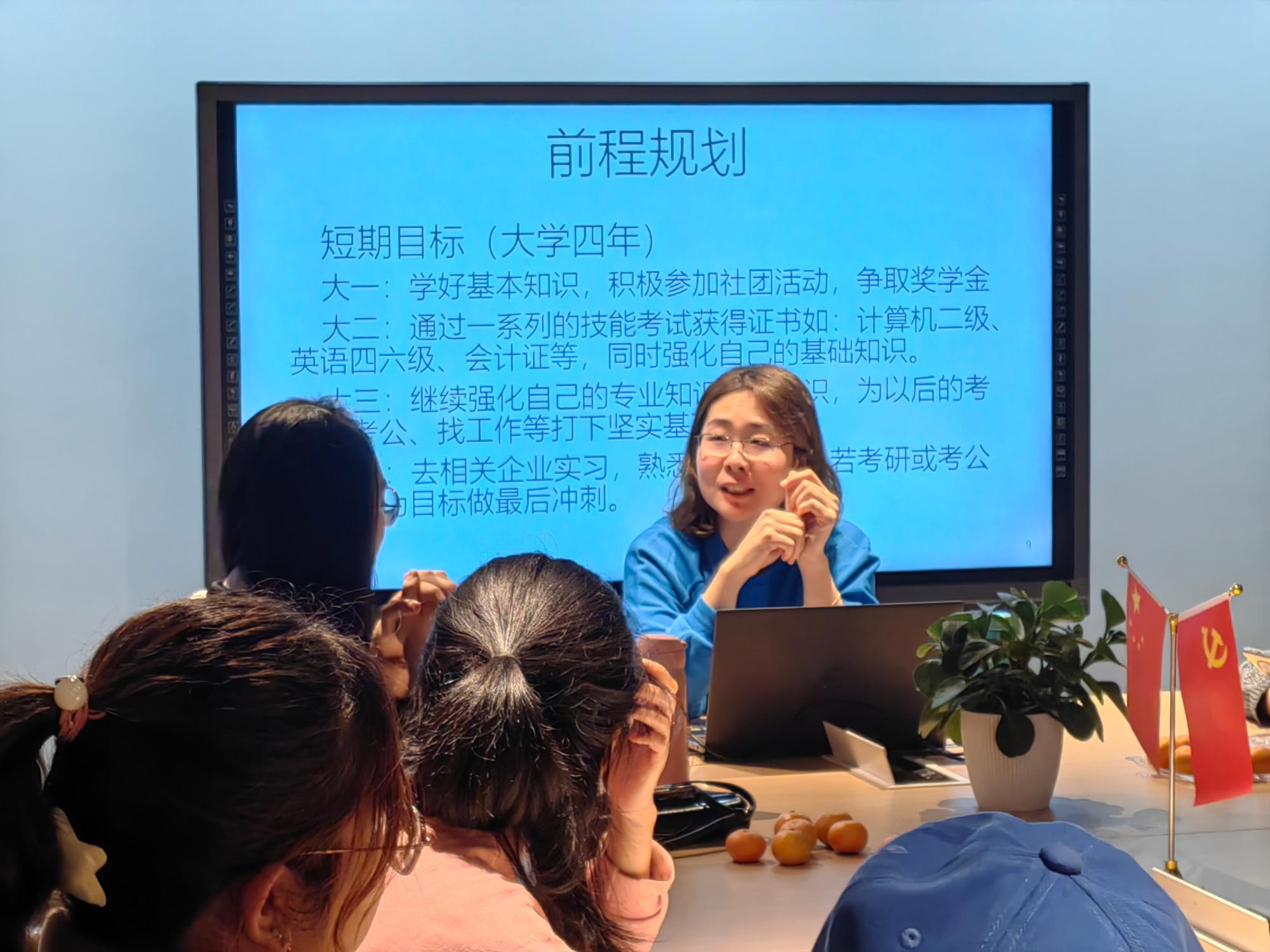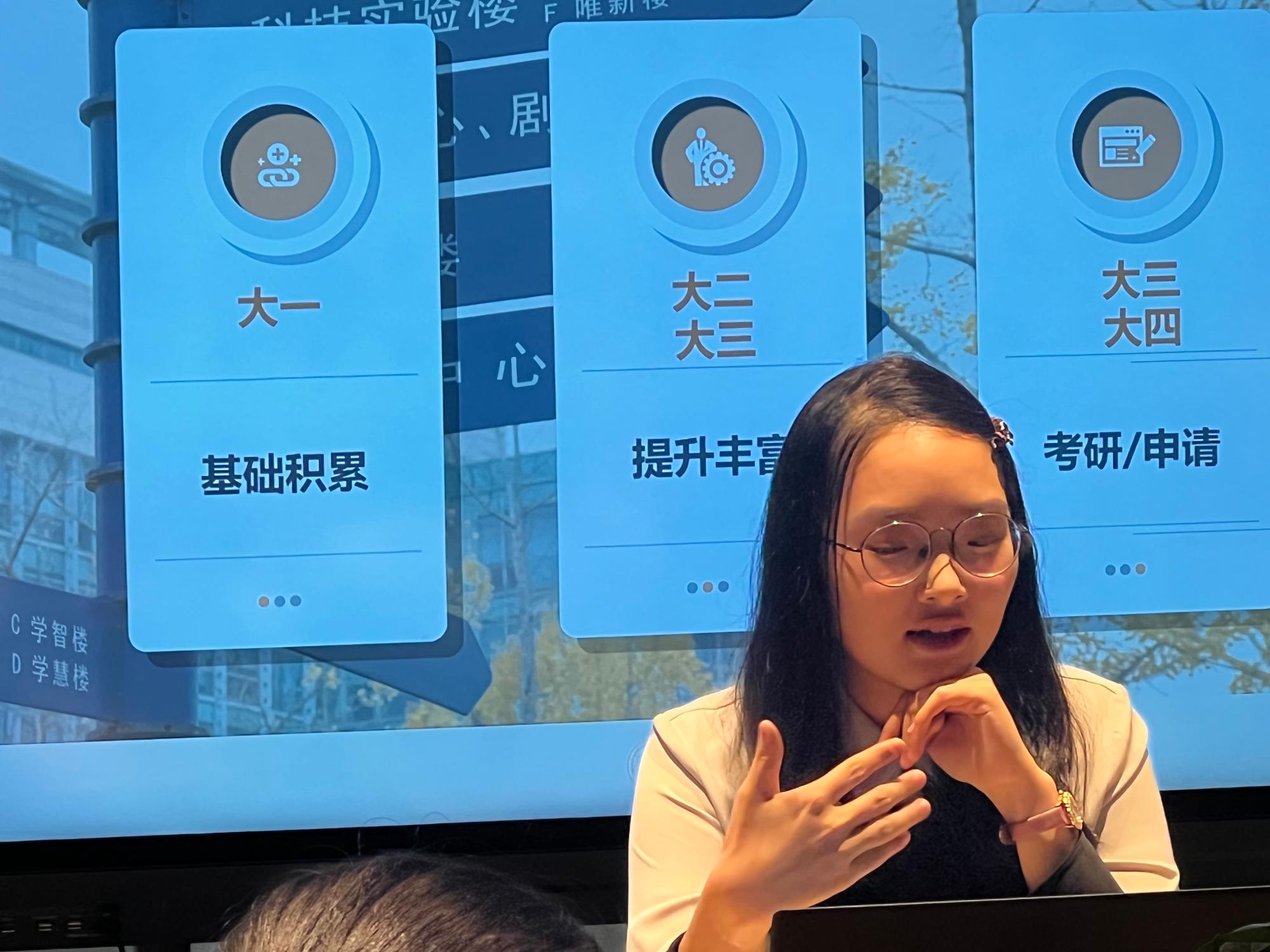 其次,项苏锐学姐就如何合理规划大学四年的问题作出了分享。首先她向在座的同学们提出一个问题:“在你们眼中,老员工活应该包括哪些内容?”于她而言,刻苦学习、参加员工活动、参加比赛是她对自己的大学初生活的畅想。“大一是一个基础积累的过程”项苏锐学姐从学业、员工工作、各类比赛的参与三个方面回顾了自己的大一生活,如每天泡图书馆、通过四六级、考注册会计师证书等。同时她也谈到如何平衡工作与学习的问题:“去列一个计划,把每项事务分配到每一个时间段”,有条不紊的工作与学习是大学四年合理规划的一个重要组成部分。“大二是一个提升丰富的阶段”,项苏锐学姐分享自己从偏爱的语言类比赛舒适区开始走向省赛的平台,她认为“比赛是一个让人迅速成长的阶段和载体”。另外,她不想局限于语言方面,渴望去更多的领域探索,因此去尝试了思创微课大赛。对于大二及接下来两年的安排,她表示自己在大二这一年结束了所有的比赛,大三大四则会全力备战考研。