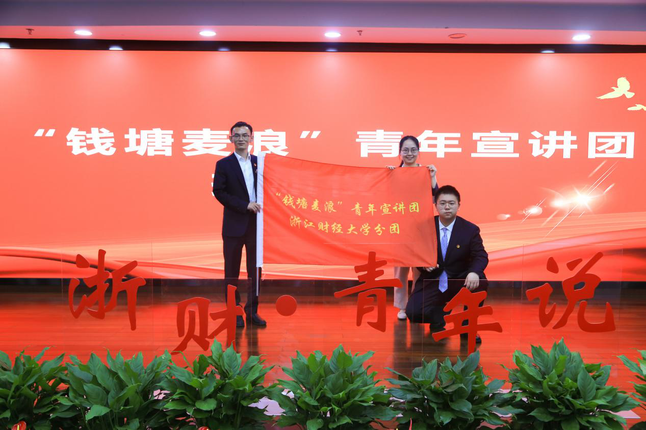 活动现场,陈州峰为宣讲团成员代表授旗,钱塘区“钱塘麦浪”青年宣讲团tyc122cc太阳成集团分团正式成立。