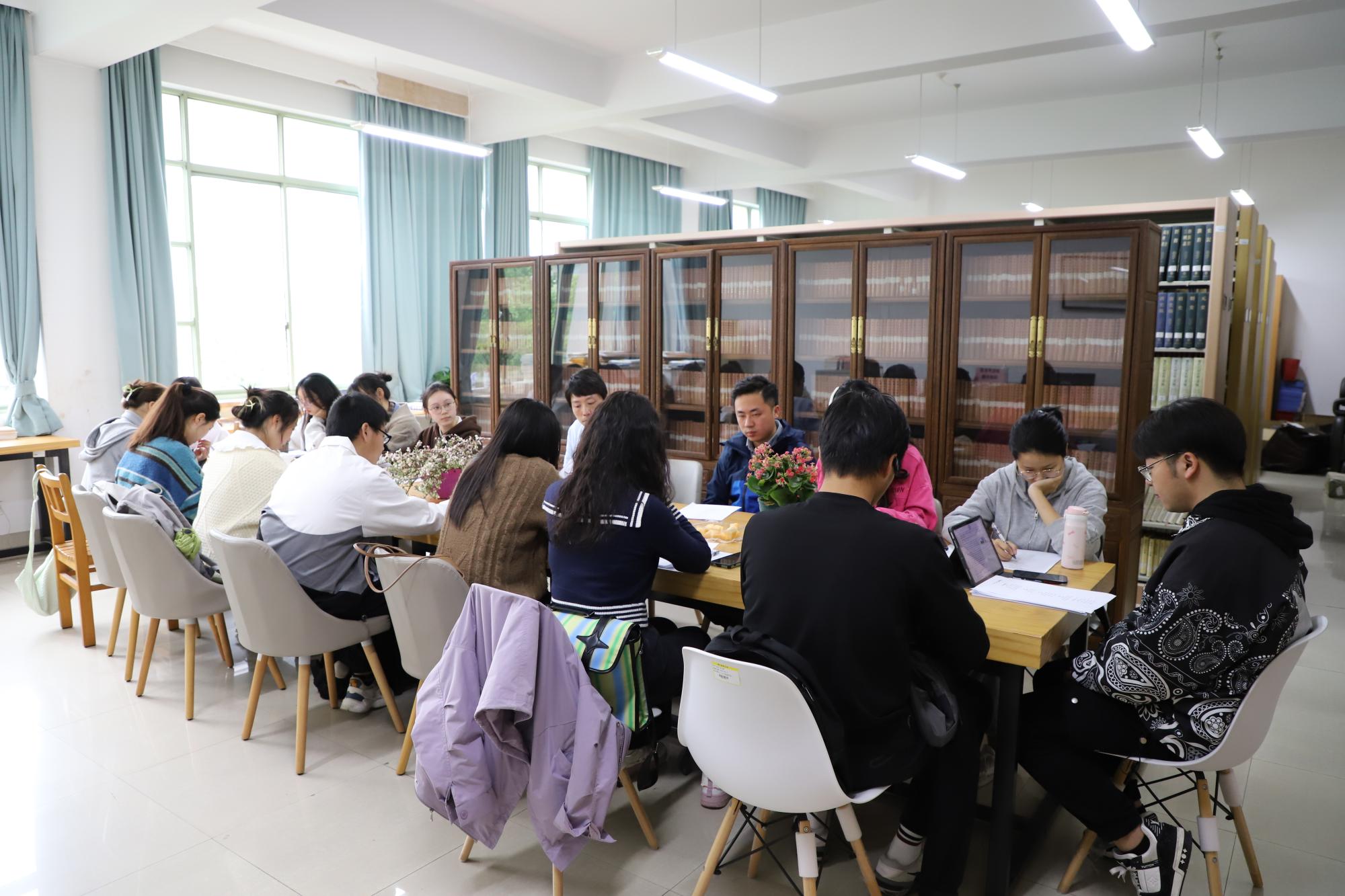 4月25日下午,暮春时分,淡云往来,tyc122cc太阳成集团第二十二期心理“悦”读会在7号楼415举办。本次阅读会由熊啸老师主讲,袁慧兰老师、马羚凯老师以及二十余名同学携着千年前古人的沉思齐聚一堂,共同鉴赏古诗韵趣,分享生活点滴。
