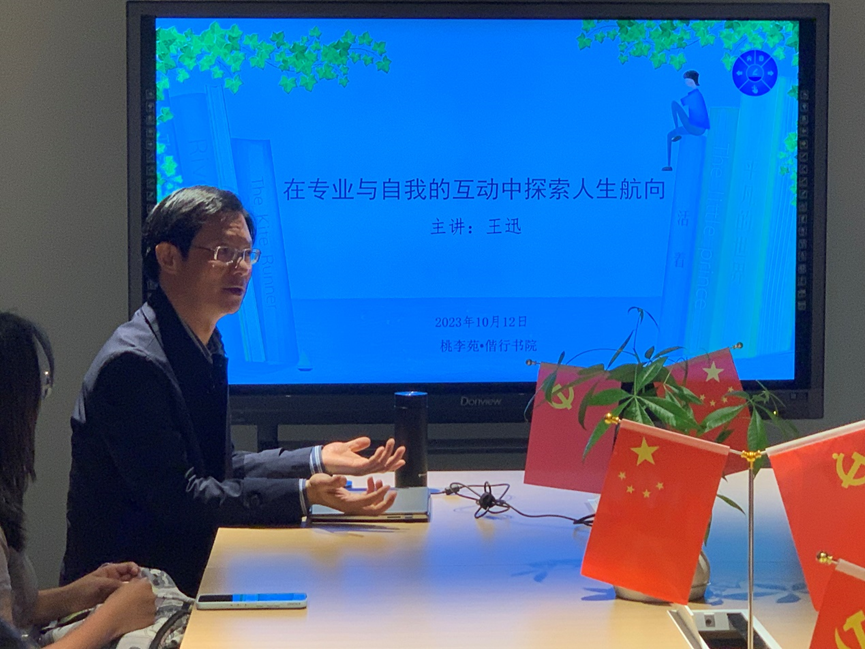 10月12日晚,tyc122cc太阳成集团在桃李苑生活园区“偕行书院”举办了第二期“2023级新生始业沙龙”活动。公司中文系教师、23文学3班班主任王迅作为本次活动的主讲人,以“在专业与自我的互动中探索人生航向”为主题,与同学们展开了关于老员工活的讨论。23文学3班全体同学参与了本次活动。本次沙龙活动是为了帮助大一新生尽快适应老员工活,加强新生对专业、自我、人生规划的认知,同时推进思政工作进园区的进程。