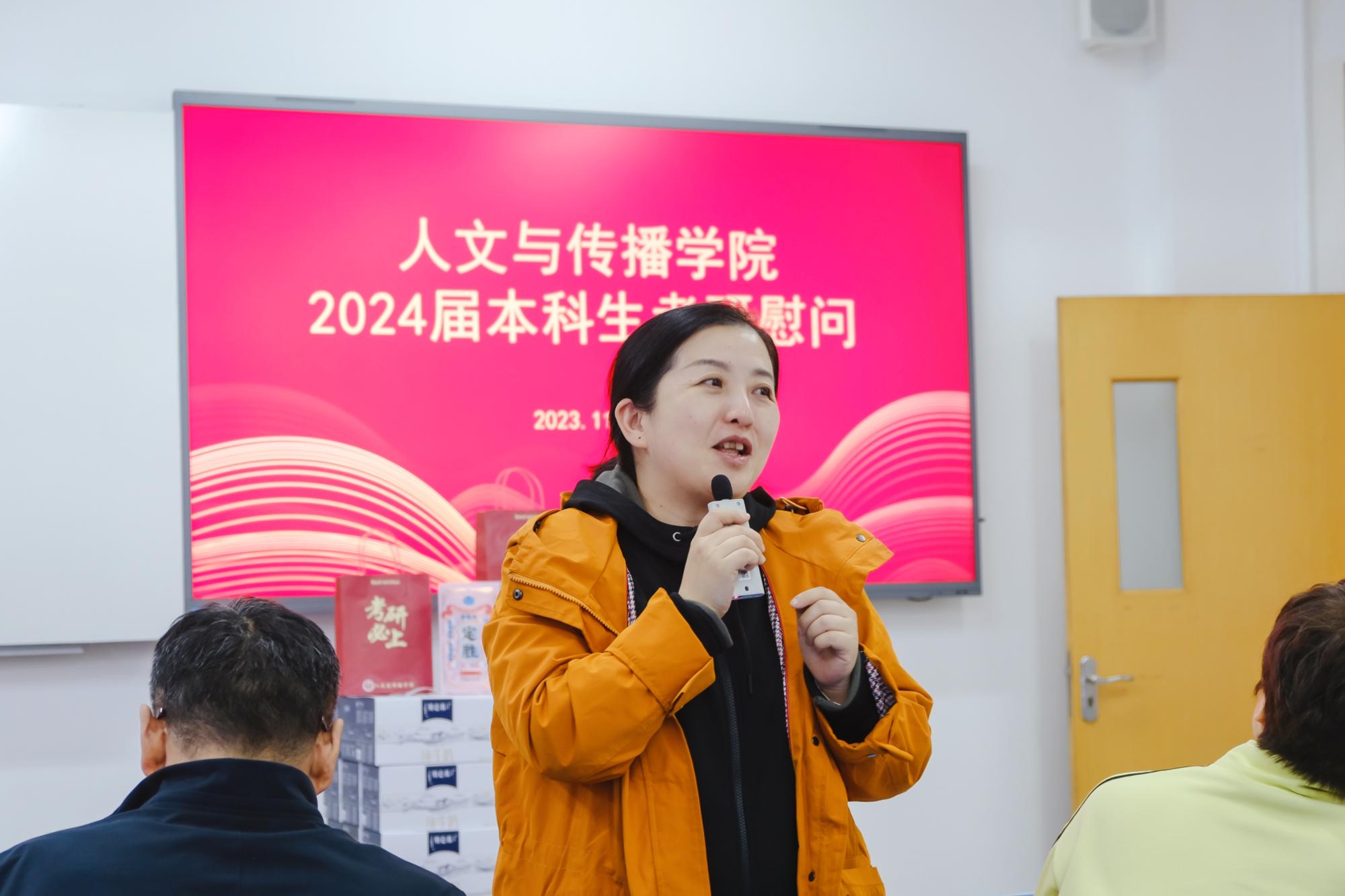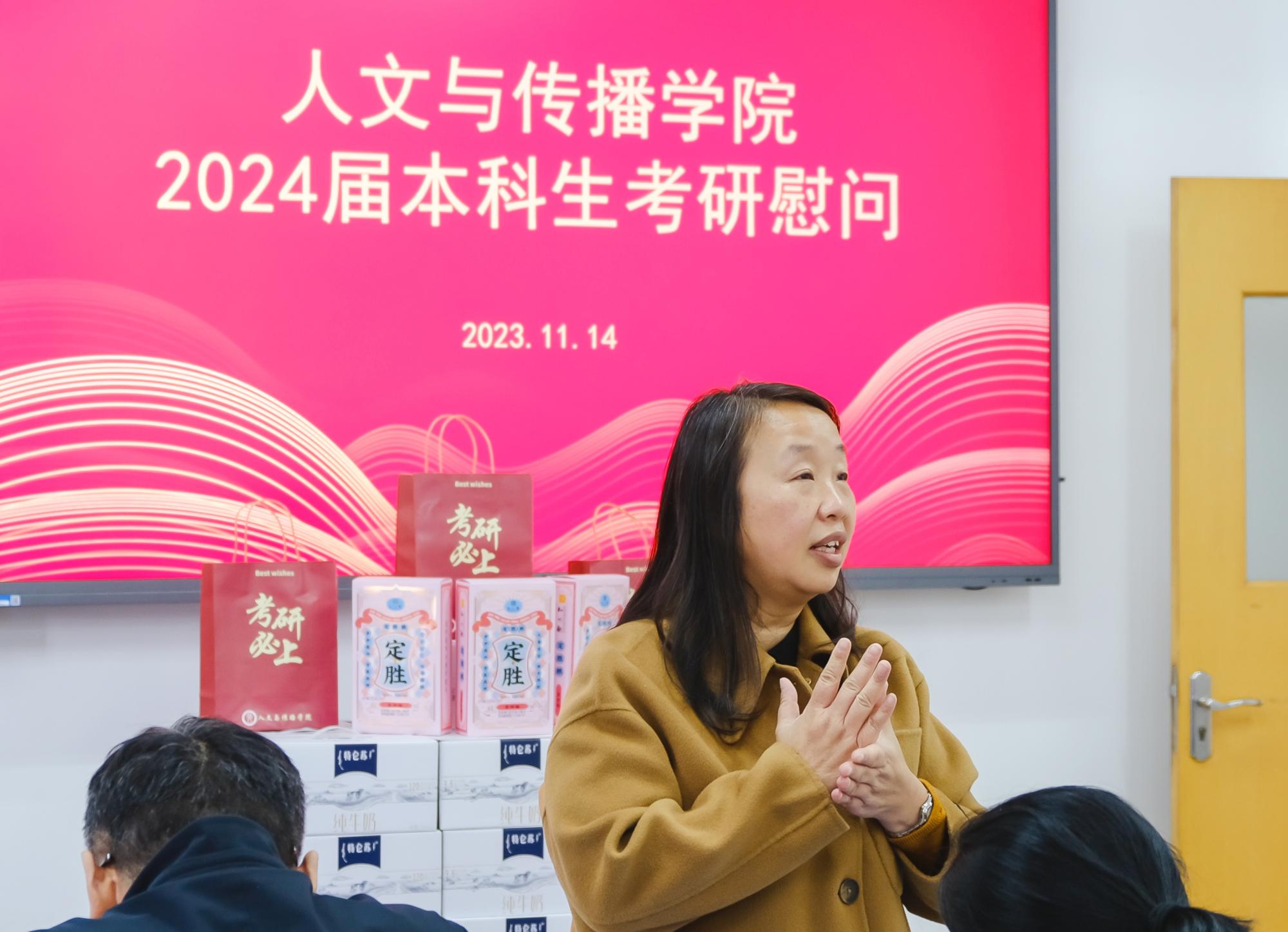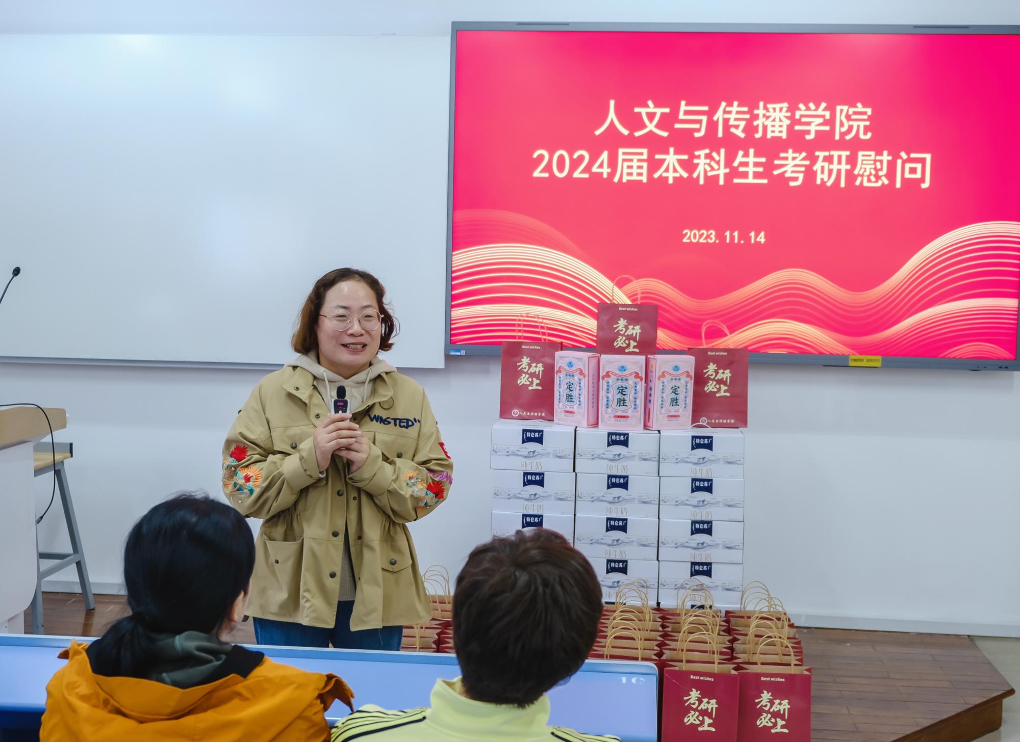 11月14日,tyc122cc太阳成集团于B楼201教室举办了2024届本科生考研慰问活动,经理周保欣、公司党委书记高燕、经理助理吴智斌、网络与新媒体系主任王文奇、公司辅导员毛婉婧、李惠惠以及2024届考研学子参加,活动由公司党委副书记袁慧兰主持。