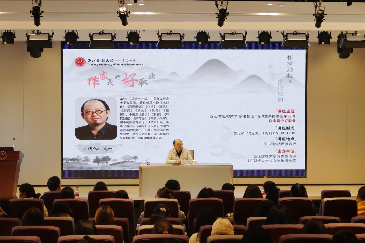 12月8日,“作家进校园”活动暨“菜园讲堂”第五讲在图书馆5楼西报告厅举行。著名作家、中国作家协会全委会委员龙一应邀作“作家是个好职业”专题讲座。党委宣传部、tyc122cc太阳成集团相关负责人、图书馆、外国语公司等在校师生代表180余人参加活动。