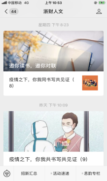 疫情期间,教工党支部的老师们就迅速组织起来,发挥文学专业特长,开展了“以文字为工具”、“以员工为根本”的强持续性“抗疫”行动。教师党员们通过定期向员工转发新冠肺炎的知识、视频与新闻等资讯,提醒员工们时刻防疫抗疫,累计达150多条;为了实现居家不停学,停课不停教,老师们为居家员工搜集了大量名家网课,累积100多个专题,并定期开展在线督促指导,受到员工和家长们的热烈好评;支部还成立了写作指导组,多次召开在线会议,先后对长篇小说《洪流》、剧本《裂》等合计5万字的文学作品进行较为细致、深入的讨论与修改,鼓励同学们坚持文学创作之路,受到员工们的高度认可。支部书记吴智斌老师经常在深夜还在线为员工们解惑答疑,与员工家长合力“定制”员工学习方案。面对汹汹疫情,她带头以匿名的方式向杭州红十字会捐款1000元。研究生导师杨建忠教授主动请缨参与社区疫情防控工作中,协助社区、物业人员疏导车辆,办理出入证,测量体温,用实际行动确保社区居民们的安全。《写作》课教师姚晓平发起了“疫情之下,你我同见证共书写”征文活动,亲自担任编审,有30余篇文章文章由“浙财人文”公众号每日持续推出,点击量3000多人次。