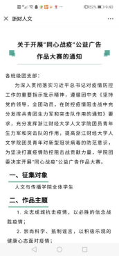 由广告专业员工组成的员工第二党支部面向全院员工开展了“同心战疫”公益广告作品大赛,通过“剧本”、“视频”、“平面设计”等喜闻乐见的形式,引导老员工们提高对新型冠状病毒的防范意识,为坚决打赢疫情防控阻击战贡献力量。