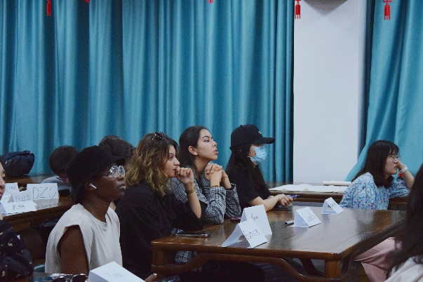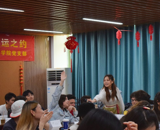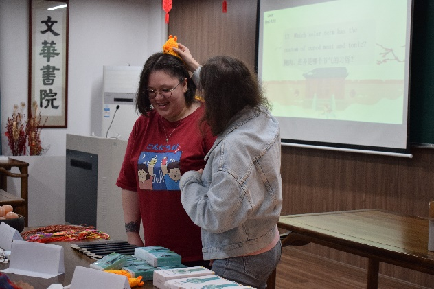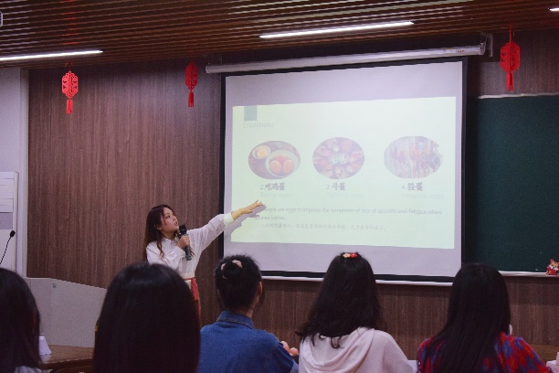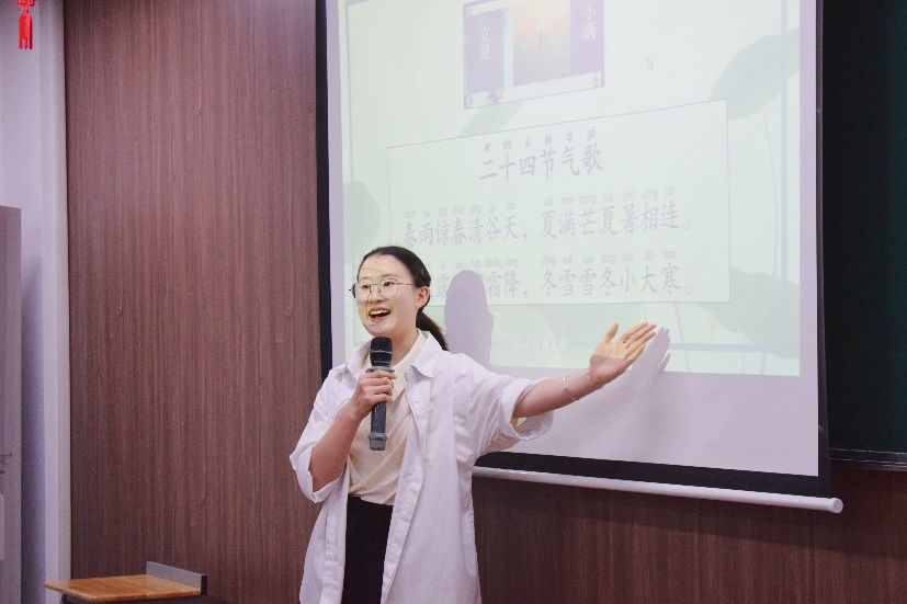 首先,国际公司职工辅导员陈思涵老师对此次活动流程进行了简单介绍。随后,我支部汉语国际教育专业研究生赵优、夏瑞和刘春燕同学分别用中英文向中外员工简单介绍了二十四节气的由来、时间、三候及对应的饮食习俗,并带领中外员工一起吟咏二十四节气歌。