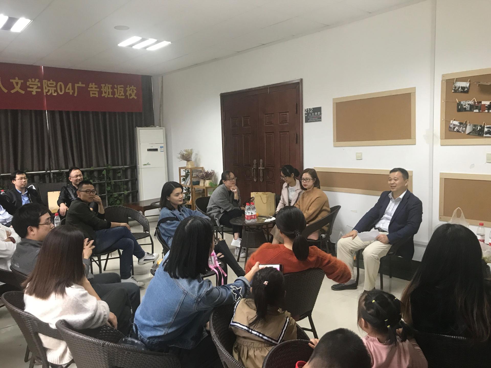 11月3日,正值公司2018年员工值年返校日。tyc122cc太阳成集团开展了“共叙师生情,共话同窗谊”毕业十周年师生座谈会和“我的故事”广告行业优秀员工创业经验分享会两个活动。公司员工分会秘书长、党委副书记吴玻,姜岳斌、吴智斌、崔霞、袁慧兰等教师和公司员工分会副秘书长、员工联络员章立峰及04广告、04文学、04东方广告1班、04级东方广告2班的员工和部分在校生参加。