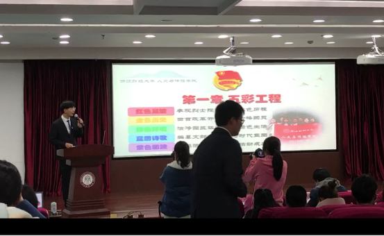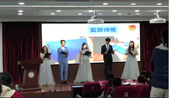 2018级文传(1)班班长兼团支部副书记郭继同学以《新时代、新青年的“五彩工程”》为主题,向在场评委和观众展示了班级团支部开展的“红色足迹”、“金色历史”、“绿色环境”、“蓝图诗歌”和“紫色团建”五大特色活动。六名同学现场朗诵了支部自己编写的歌颂红船精神的“蓝图诗歌”,充分展现tyc122cc太阳成集团的专业特色,展示了公司团员青年的精神风貌和团支部活力建设的优秀成果。