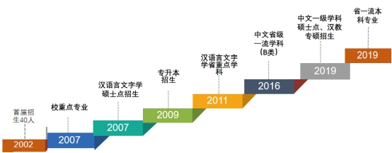 汉语言文学专业2002年开始招生,现已发展成“省一流学科”“一级学科硕士点”“省一流专业”并驾齐驱的喜人局面,其发展沿革的关键节点如下图: